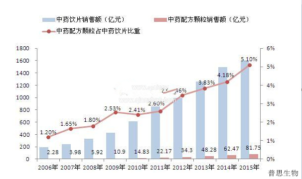 近年來(lái)中藥配方顆粒保持快速增長(zhǎng)態(tài)勢(shì),2006-2015年,中藥配方顆粒全國(guó)銷(xiāo)售額年均復(fù)合增速高達(dá)48.84%,遠(yuǎn)高于同期中藥飲片26.7%的增長(zhǎng)。