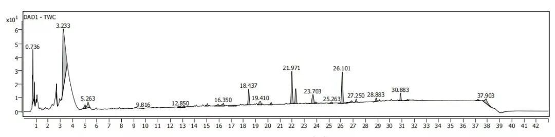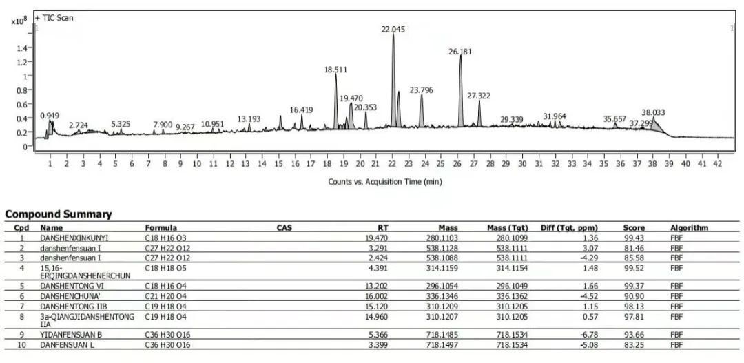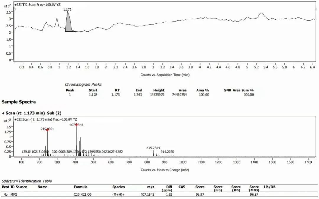 中藥材、浸膏/粉、復(fù)方制劑、發(fā)酵液等復(fù)雜樣品的化學(xué)成分分析。依托UPLC的高效分離能力和Q-TOF的快速鑒定能力,對(duì)各個(gè)特征峰進(jìn)行分析。通過多維信息分析給予推測(cè)分子式,再通過譜庫鑒定給予推測(cè)結(jié)構(gòu)式。