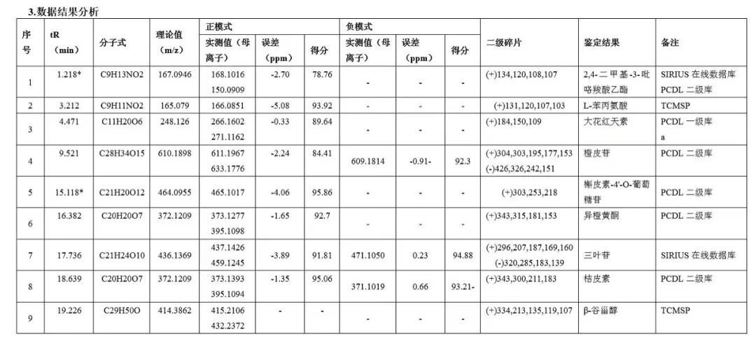 通過精確質(zhì)量、同位素豐度比、同位素精確質(zhì)量比及MS/MS四維信息關(guān)聯(lián)分析給予推測(cè)分子量、分子式,部分化合物可通過譜庫鑒定給予結(jié)構(gòu)式。