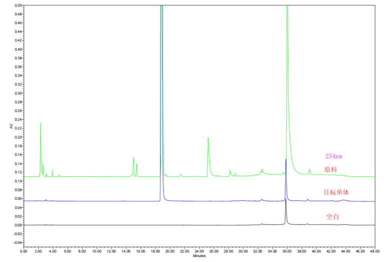 制備液相優(yōu)化:選用內(nèi)徑150mm系統(tǒng),梯度洗脫結(jié)合動態(tài)軸向壓縮柱技術(shù),單批次處理量達(dá)50g原料,獲得目標(biāo)成分120g,純度99.2%(HPLC圖譜見下圖)原料及單體分離圖譜: