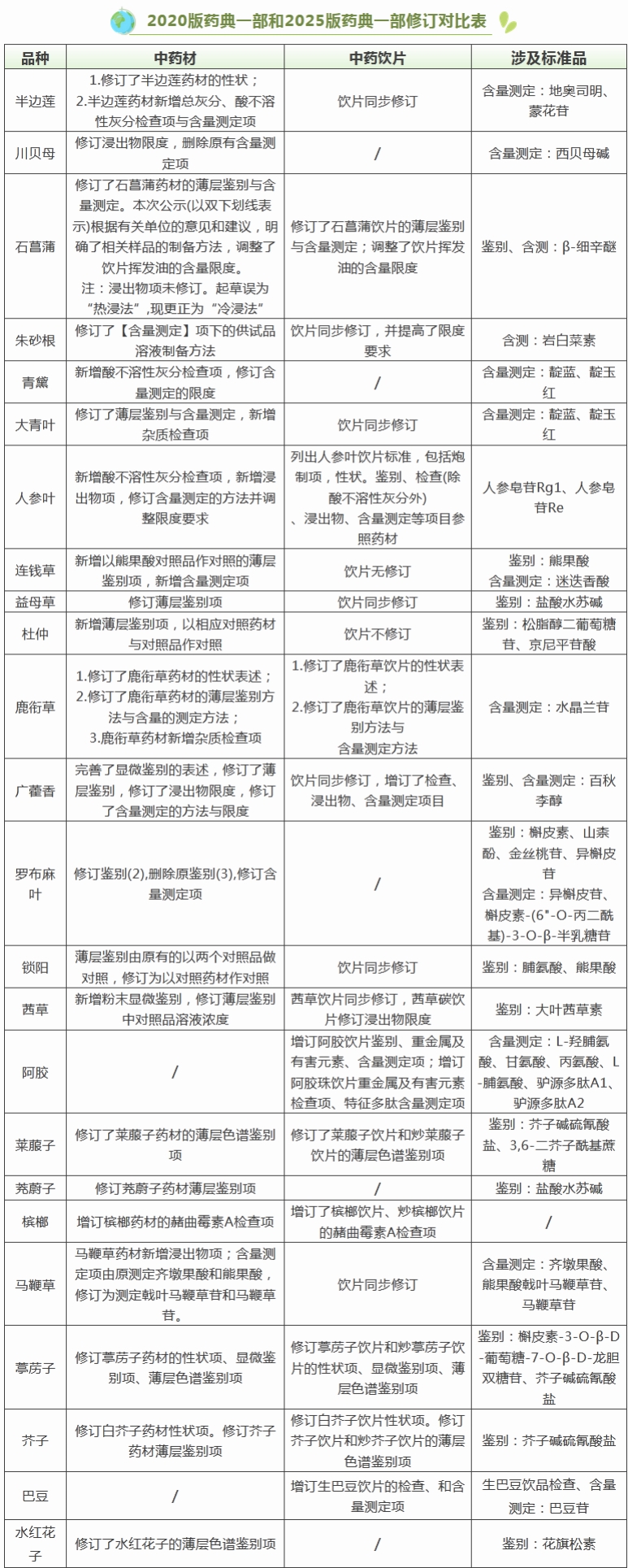2025版藥典一部對(duì)比2020版藥典一部增修訂情況