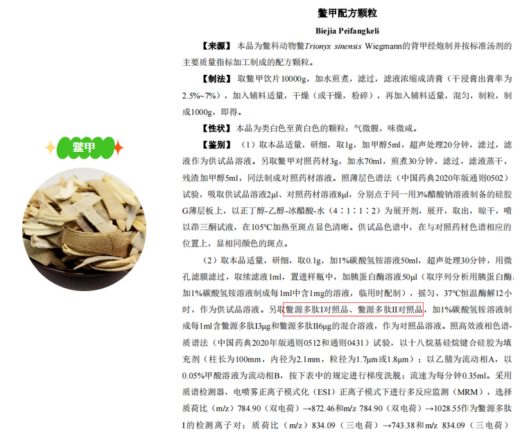 鱉甲來源于鱉科動物鱉Trionyx sinensis Wiegmann 的背甲,常以生鱉甲醋炙,可去除其腥味,藥性易于煎出。鱉甲具有滋陰潛陽,軟堅散結(jié),退熱除蒸的功效,臨床主要用于治療陰虛發(fā)熱,虛風(fēng)內(nèi)動,癥瘕等病癥。普思生物新品鱉源多肽I、鱉源多肽II對照品,有效對鱉甲、醋鱉甲配方顆粒進(jìn)行質(zhì)量控制。