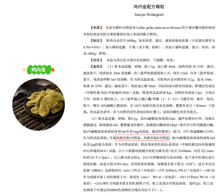 雞內(nèi)金為雉科動物家雞Gallus gallus domesticus Brisson的干燥沙囊內(nèi)壁,具有健胃消食,澀精止遺,通淋化石的功效,臨床上廣泛應(yīng)用于食積不化、小兒疳積、遺尿、遺精,又可用于膽結(jié)石、尿路結(jié)石等病癥的治療。普思生物新品雞源多肽I、雞源多肽II對照品,有效對雞內(nèi)金、炒雞內(nèi)金配方顆粒進(jìn)行質(zhì)量控制。