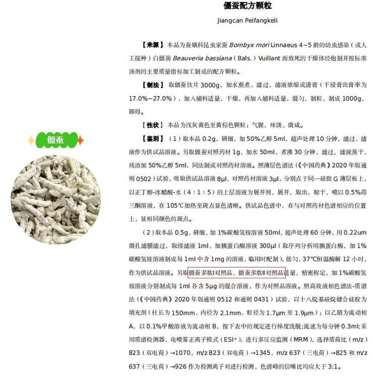 僵蠶為蠶蛾科昆蟲家蠶Bombyx mori Linnaeus 4?5齡的幼蟲感染(或人工接種)白僵菌Beauveria bassiana (Bals.) Vuillant而致死的干燥體,具有息風(fēng)止痙、祛風(fēng)止痛、化痰散結(jié)的功效。普思生物新品僵蠶多肽I、僵蠶多肽II和僵蠶八肽對照品,有效對僵蠶、炒僵蠶配方顆粒進(jìn)行質(zhì)量控制。